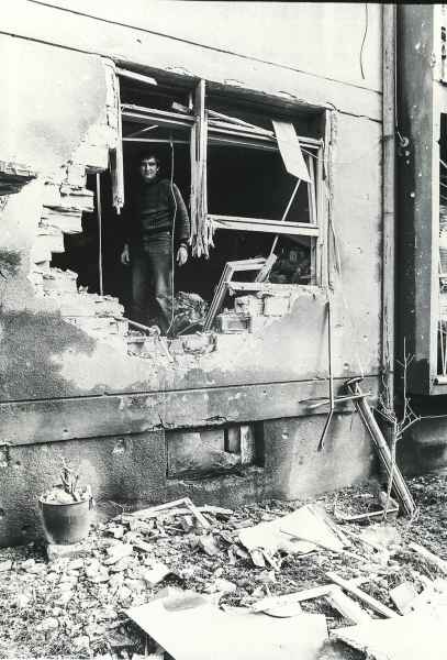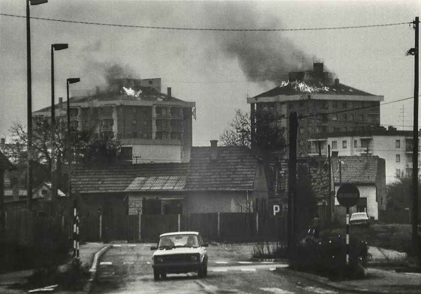 Zapaljeni neboderi u Vinkovcima, nakon što su pogođeni maljutkama ispaljenima iz Ostrova. Ulica Antuna Branka Šimića (Lapovci).