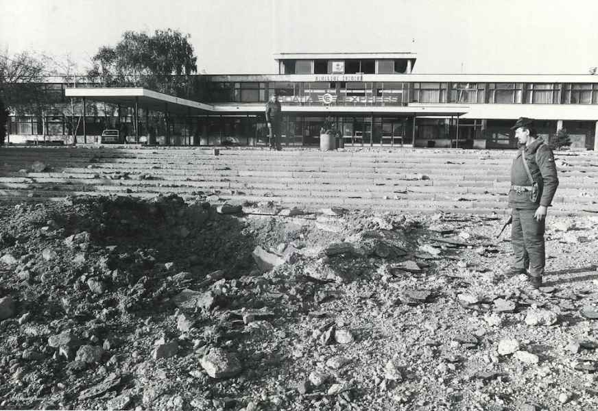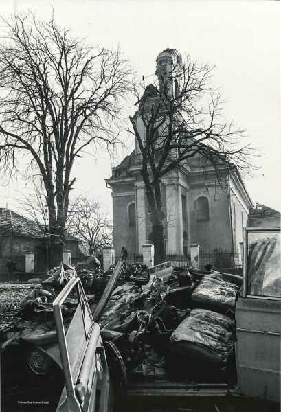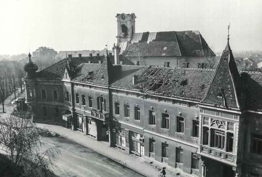 Devastirana zgrada Brodske imovne općine i Crkva sv. Euzebija i Poliona nakon granatiranja centra Vinkovaca.