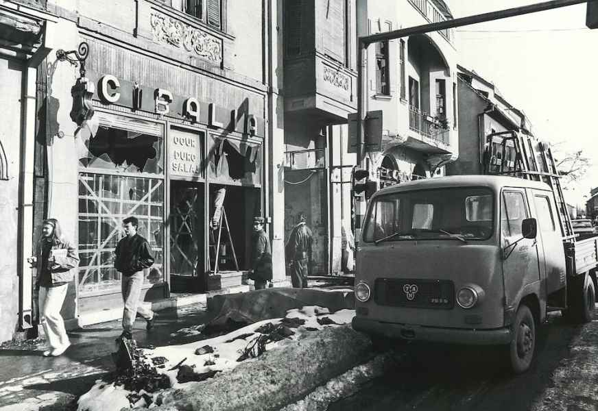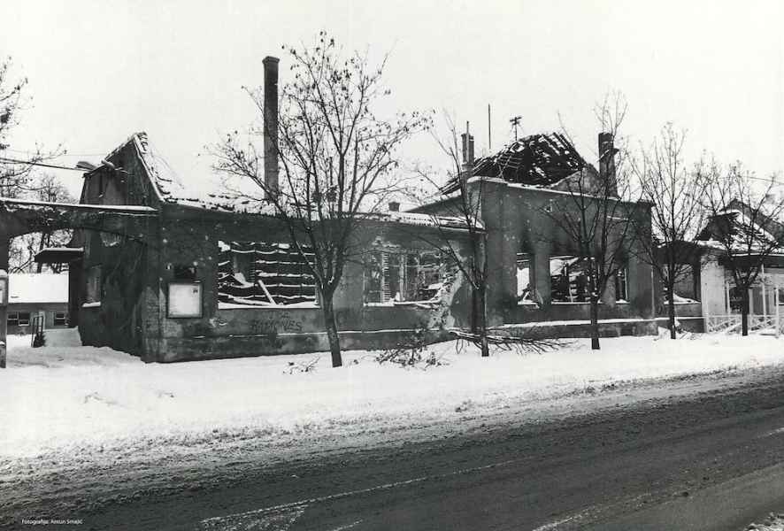 Razorena i spaljena Narodna knjižnica u Vinkovcima. Ulica kralja Zvonimira.