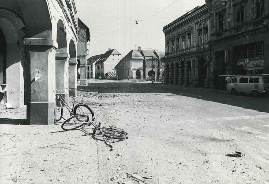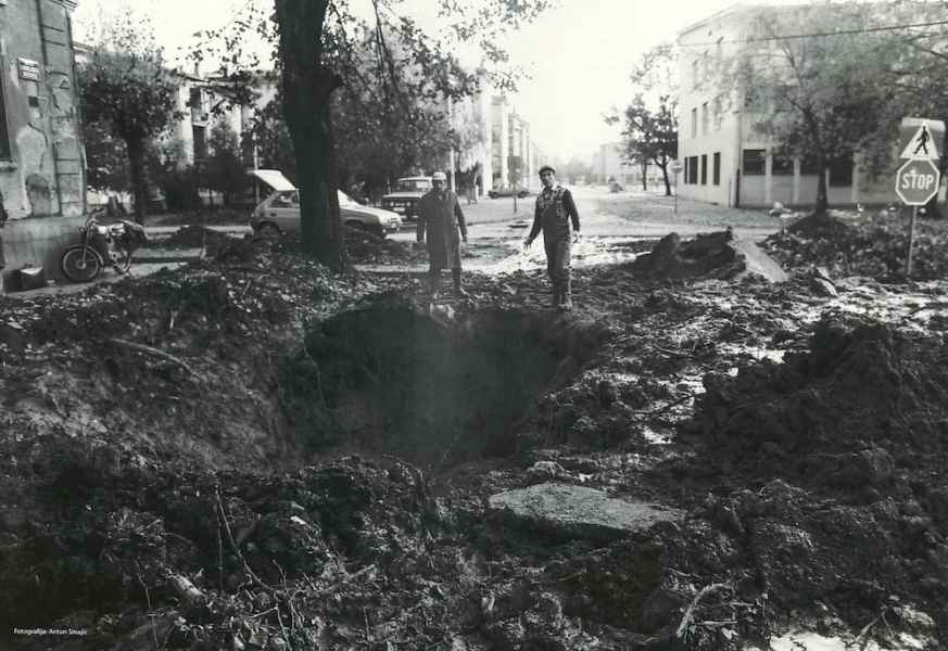 Teško oštećen kolnik nakon granatiranja Vinkovaca. Početak ulice Ivana Kukuljevića Sakcinskoga.