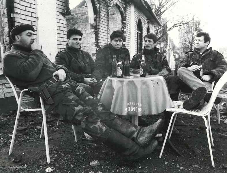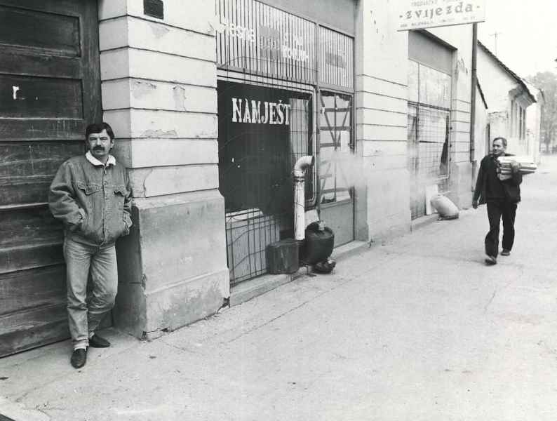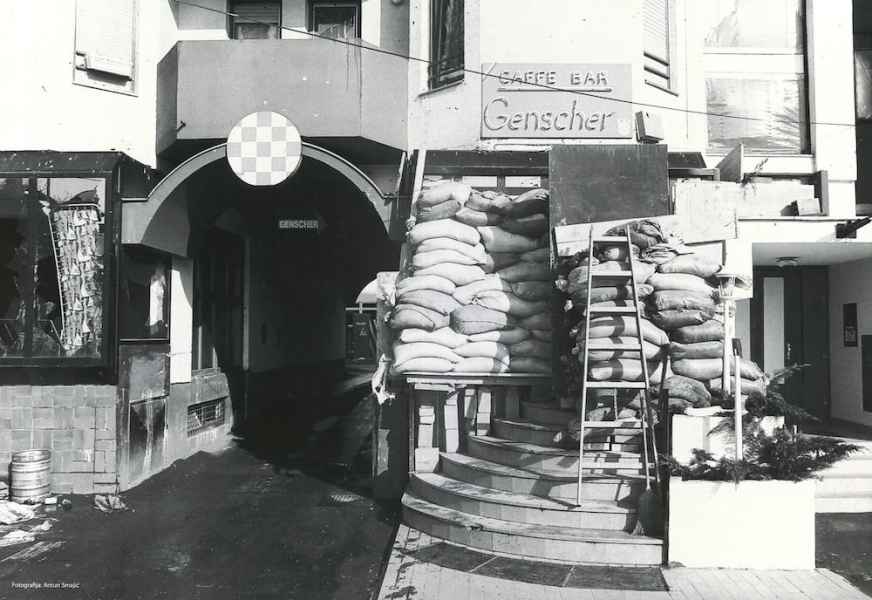Caffe bar „Genscher“ zaštićen vrećama s pijeskom. Duga ulica u Vinkovcima.