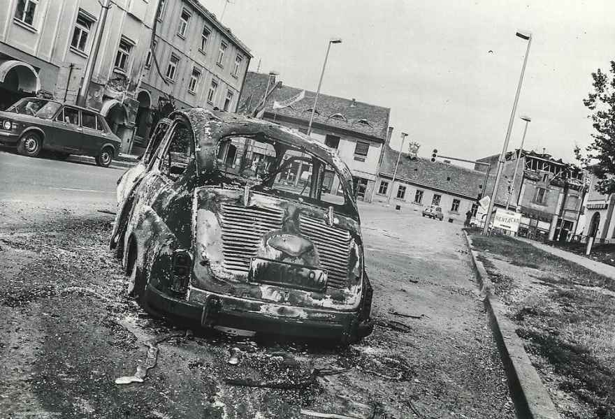 Zapaljeni „fićo“ nakon granatiranja centra Vinkovaca. Početak ulice Hansa Dietricha Genschera (između kompleksa „Termi“ i Hotela Slavonija).