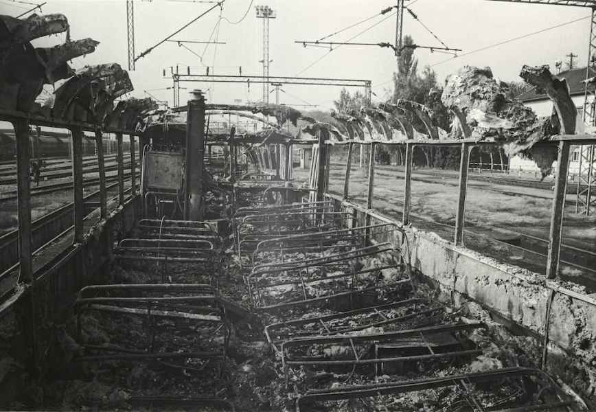 Posljedice granatiranja željezničkog kolodvora u Vinkovcima (pročelje zgrade kolodvora – ulica Andrije Hebranga i uništeni šinobus).