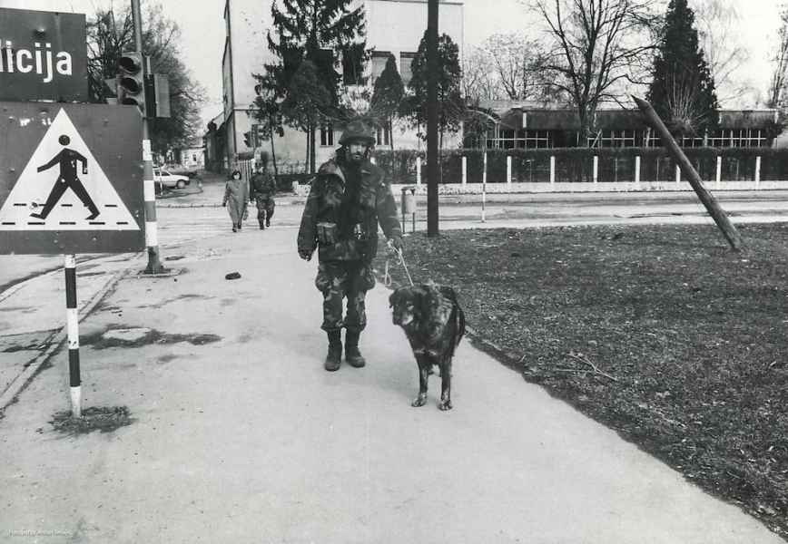 Hrvatski branitelj sa psom. Križanje ulica kralja Zvonimira i Jurja Dalmatinca (ispred zgrade PIK-a Vinkovci).