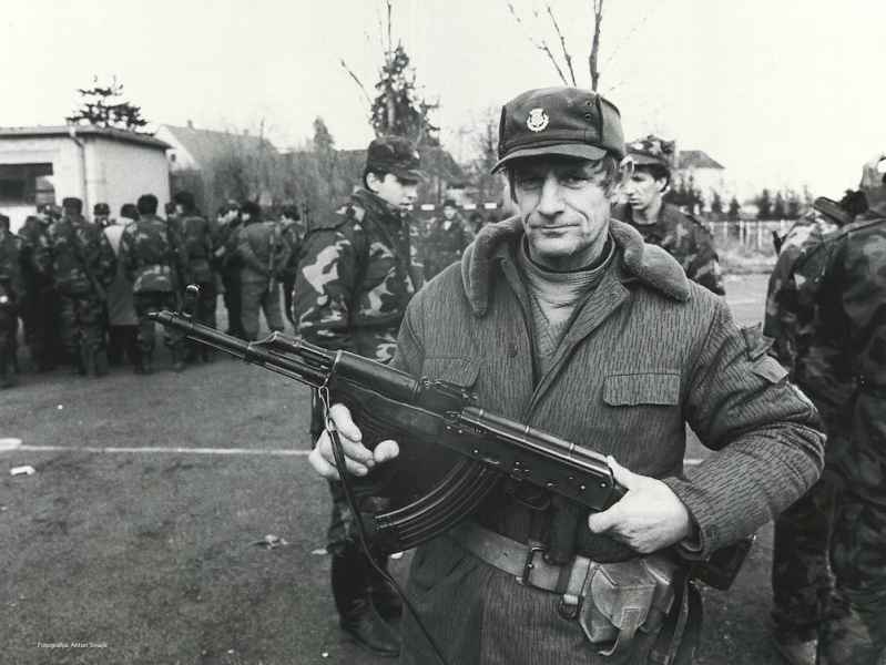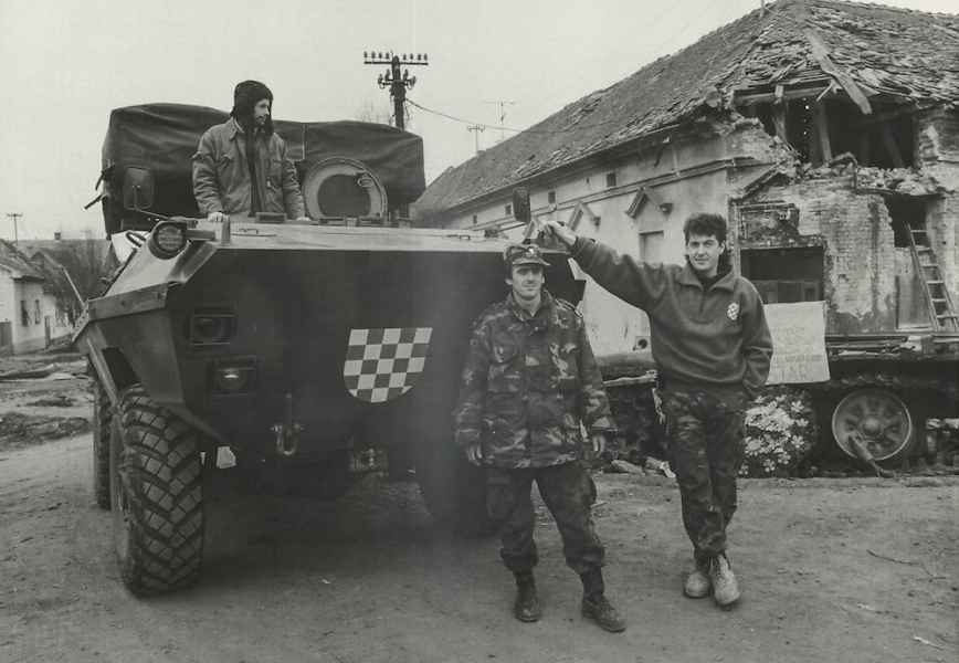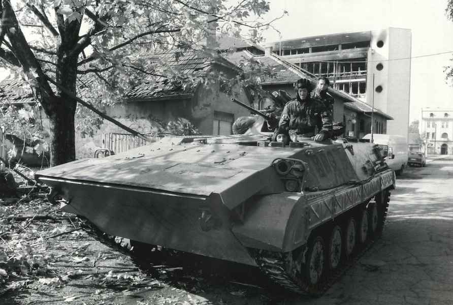 Hrvatski branitelji na zarobljenom oklopnom transporteru. Vinkovci, ulica Jurja Dalmatinca (ispred Doma omladine).