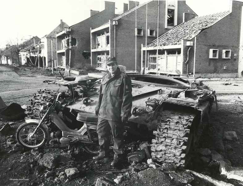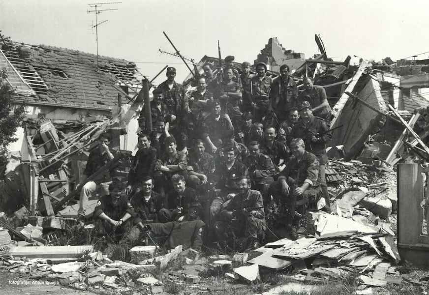 Hrvatski branitelji pokraj borbenog oklopnog vozila u centru Nuštra (u pozadini uništeni neprijateljski tenk).